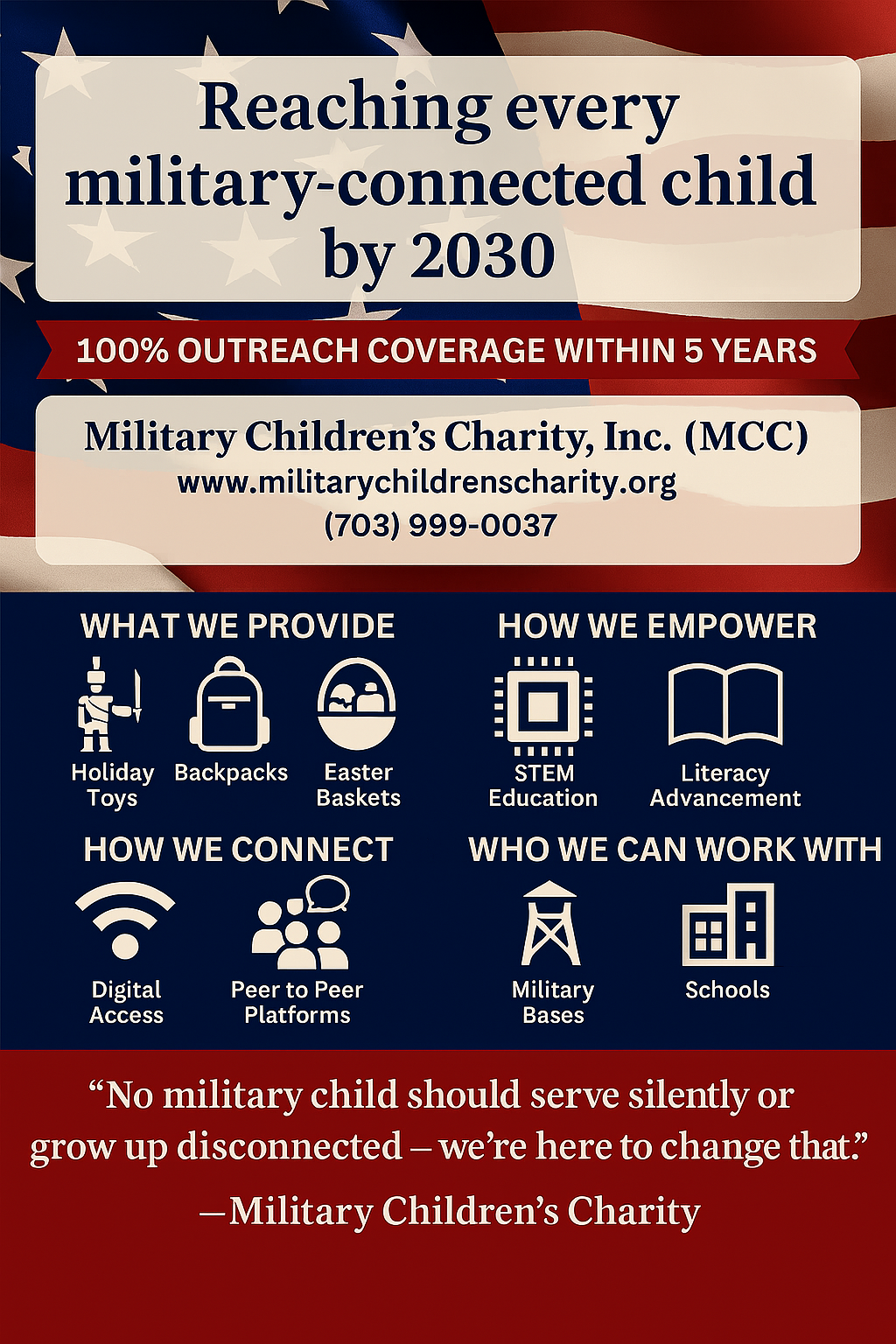 Military Children’s Charity, Inc. (MCC) envisions a future, where every military-connected child and teenager regardless of duty station, deployment disruption, geographic separation, or personal loss is seen, celebrated, supported, and empowered in community with purpose.